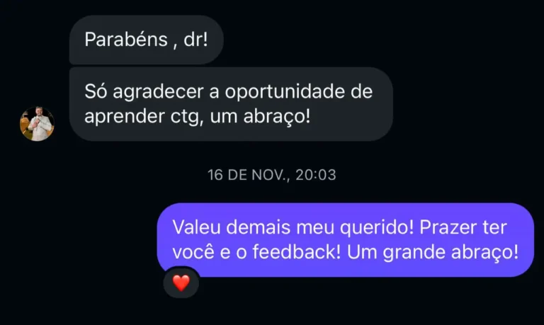 Você terá acesso ao grupo exclusivo no WhatsApp onde pode tirar dúvidas diretamente com Dr. Gabriel e trocar experiências com outros alunos. Além disso, temos as sessões Q&A ao vivo mensais.